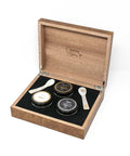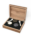 Burl wood gift box, 3 x 1oz caviar selections, 2 mother of pearl spoons
